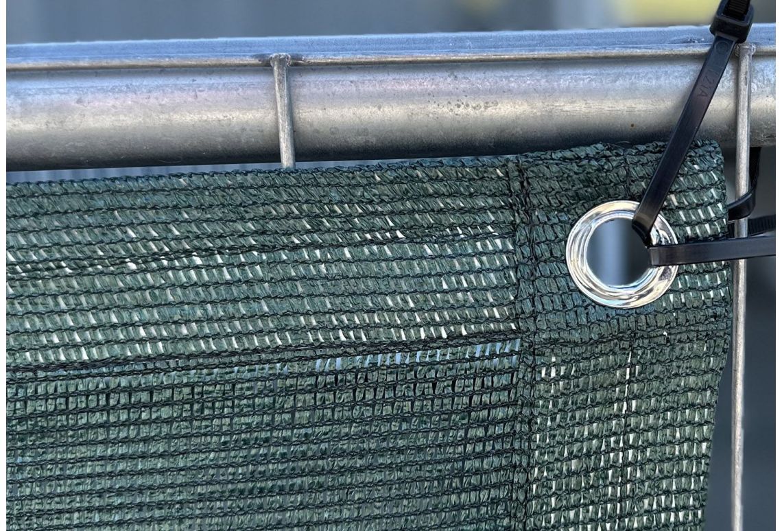 Montage: zet het bouwhekdoek in iedere hoek met twee tie-wraps vast - één om de horizontale buis en één om de verticale buis van het bouwhek. Zet het doek vervolgens om de 30 cm vast door een tie-wrap door de omgezoomde sterke rand te halen.