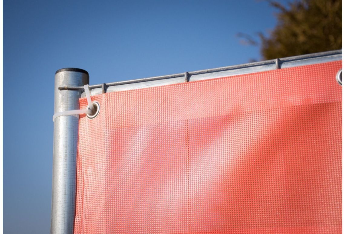 Montage: zet het bouwhekdoek in iedere hoek met twee tie-wraps vast - één om de horizontale buis en één om de verticale buis van het bouwhek. Zet het doek vervolgens om de 30 cm vast door een tie-wrap door elke ring te halen.