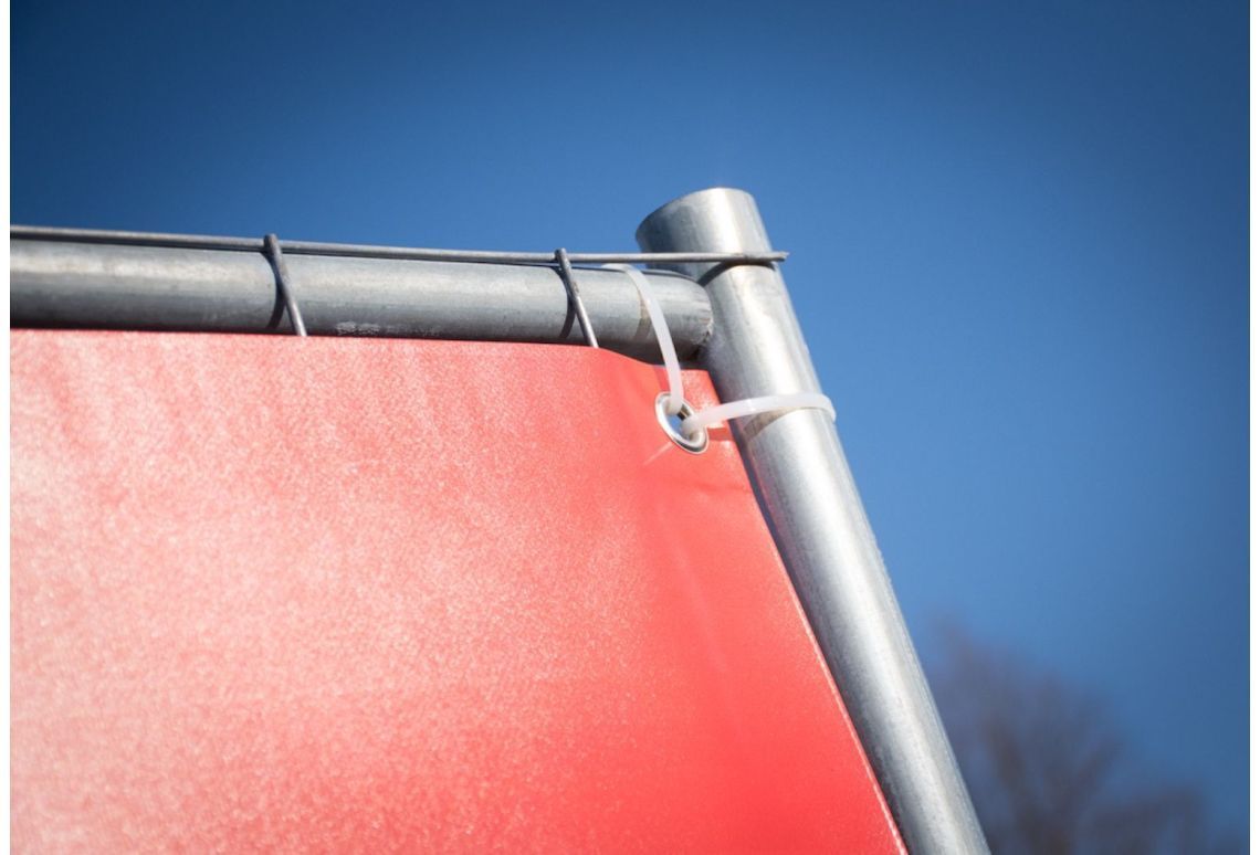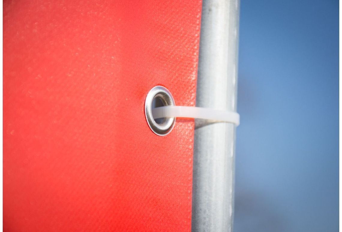 Montage: Bevestig het doek in de hoeken met twee tie-wraps: één om de horizontale buis en één om de verticale buis van het bouwhek. Zet het doek vervolgens om de 50 cm vast door een tie-wrap door elke ring te halen.