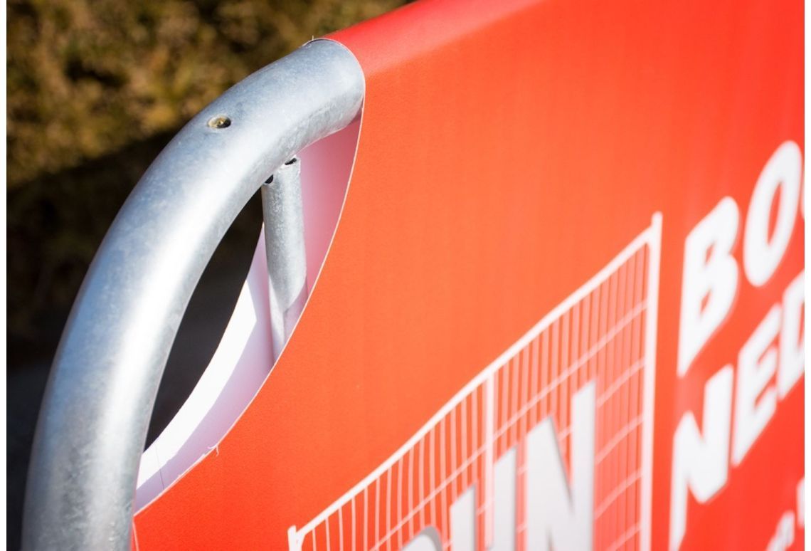 Elke zijde heeft een afmeting van 243 x 77 cm, wat samen neerkomt op een totaalformaat van 243 x 161,6 cm. De banner valt als een jas over het dranghek, waardoor hij stevig en strak blijft zitten. Voor een betrouwbare bevestiging kan de banner eenvoudig aan de buitenzijden en onderzijde worden vastgezet met tie-wraps.
