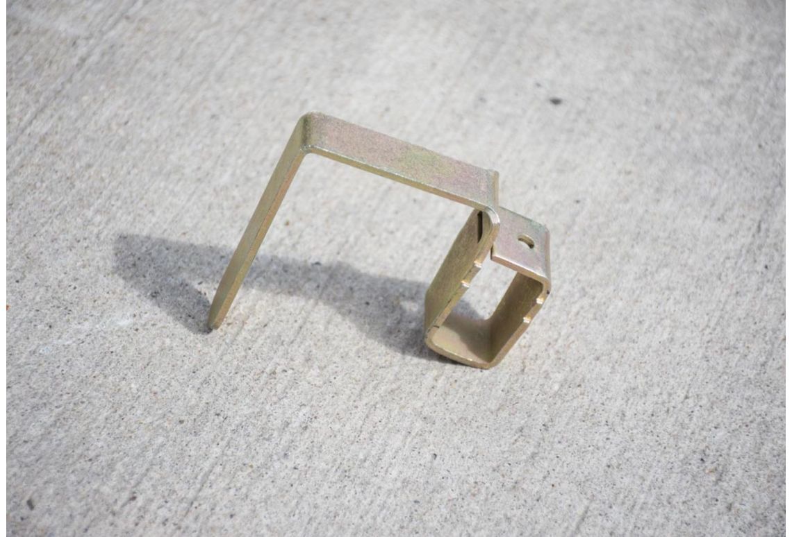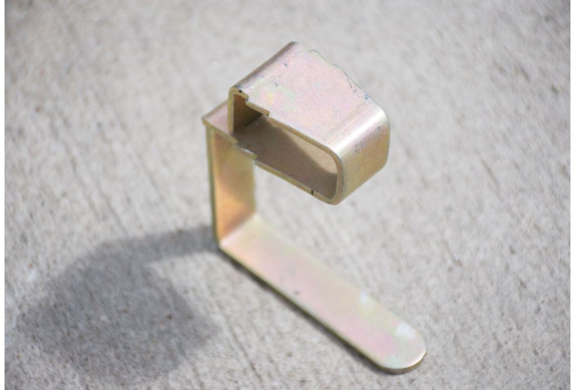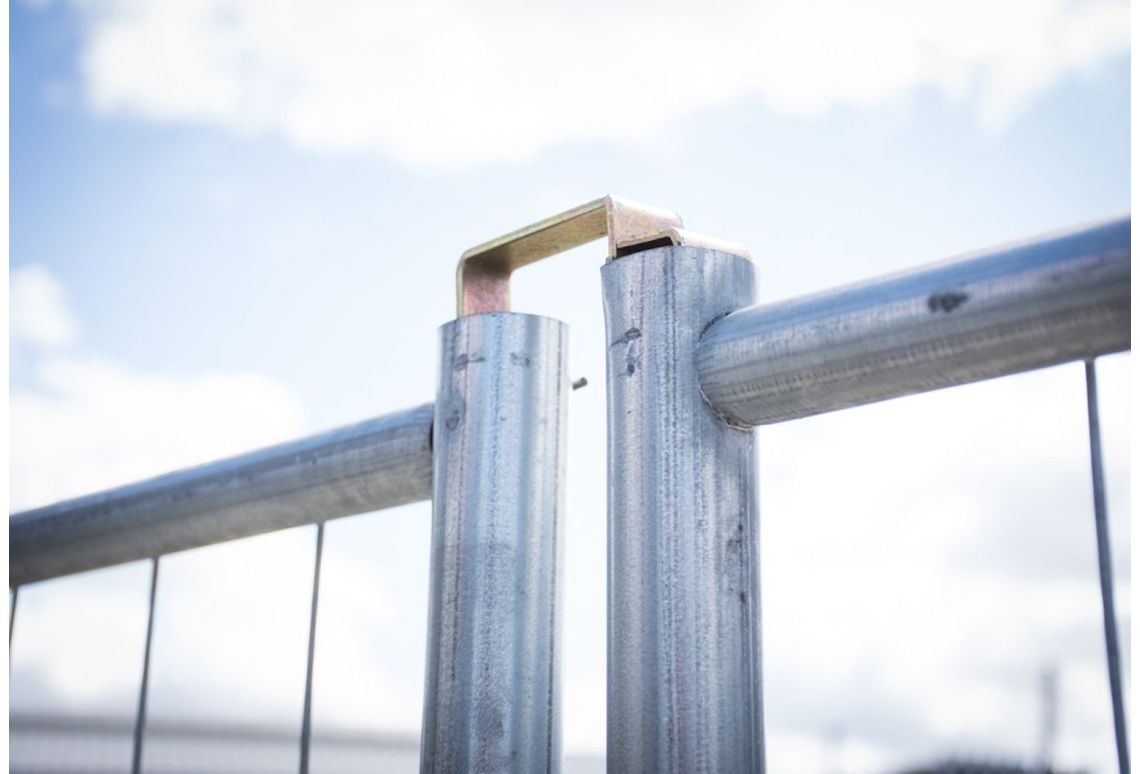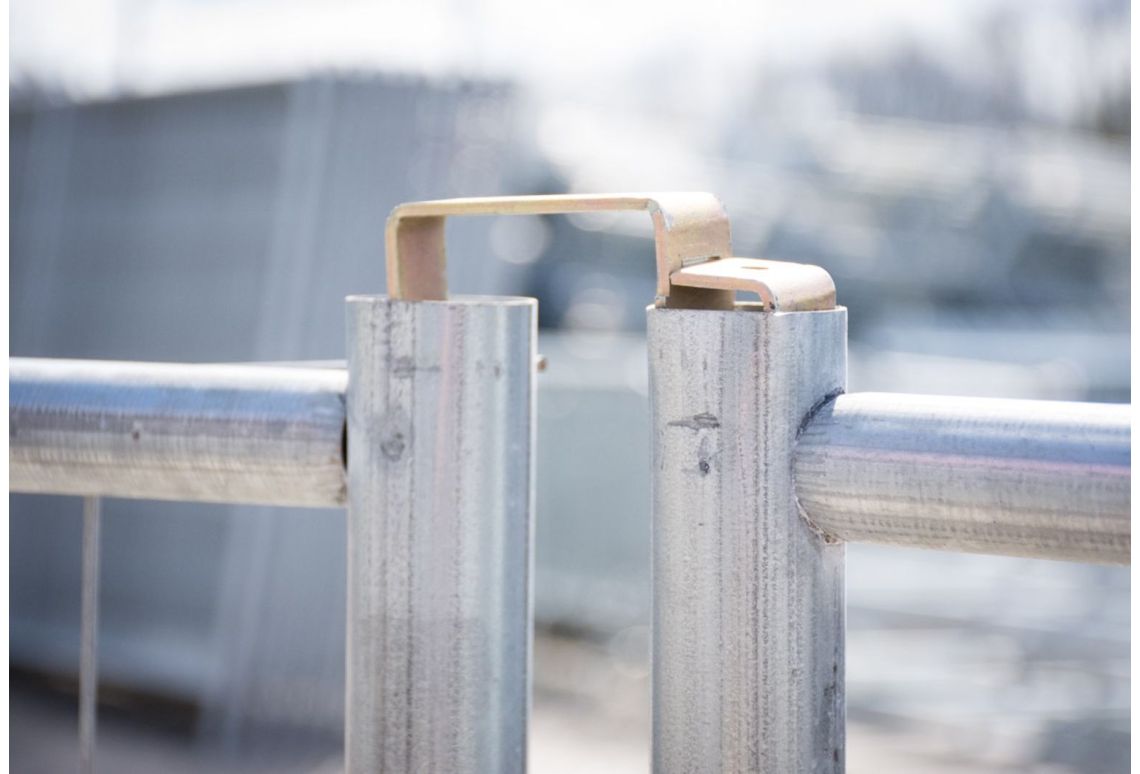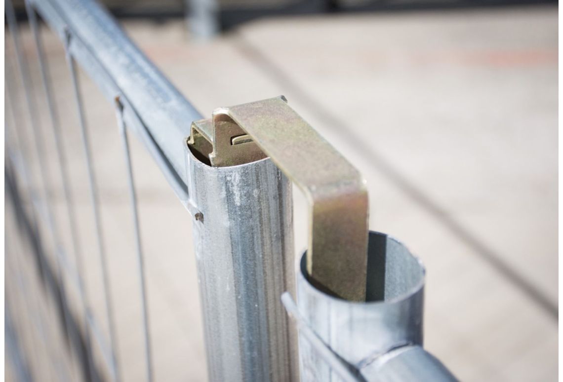 Met deze praktische haak-en-oogverbinding koppel je bouwhekken in een handomdraai aan elkaar. Sla het oog eenvoudig met een hamer in de bovenkant van de buis, en haak het volgende hek eraan vast.