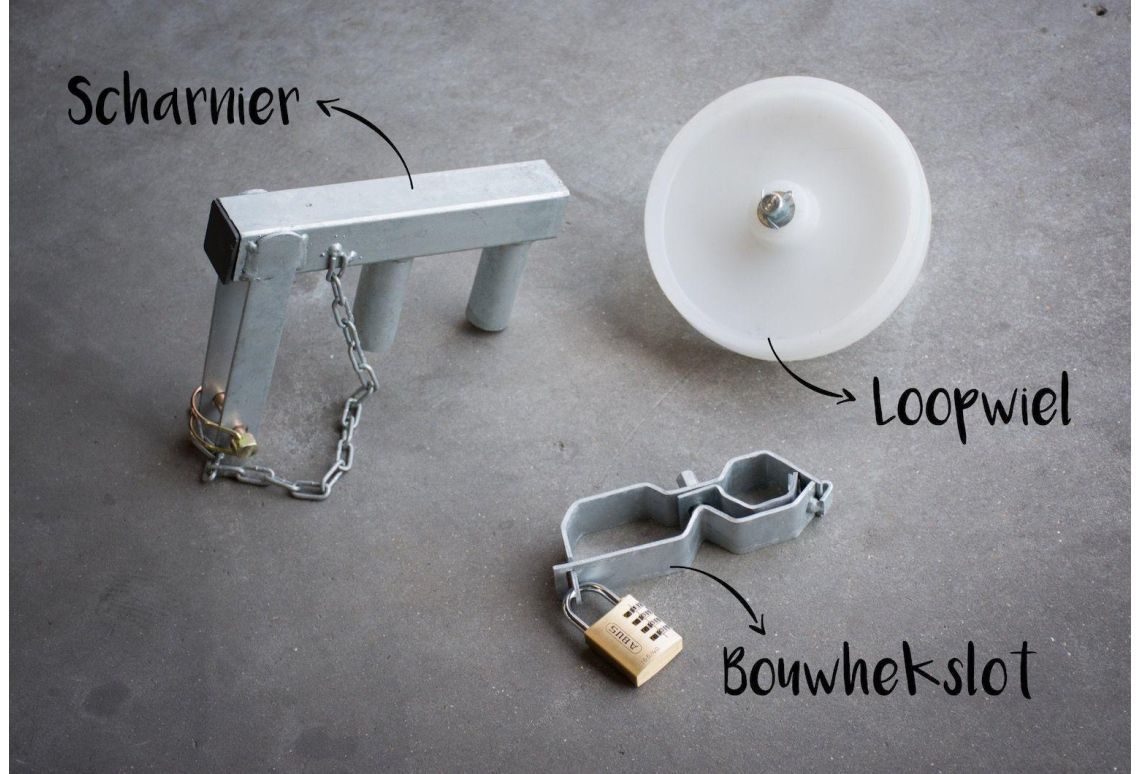 Bevestig het scharnier aan de bovenkant van de staanders van twee gekoppelde bouwhekken. Monteer vervolgens het loopwiel onderaan de staander van het bouwhek dat je als 'deur' wilt gebruiken. Aan het eind van de werkdag sluit je het terrein eenvoudig af met het bouwhekslot en een cijferslot.