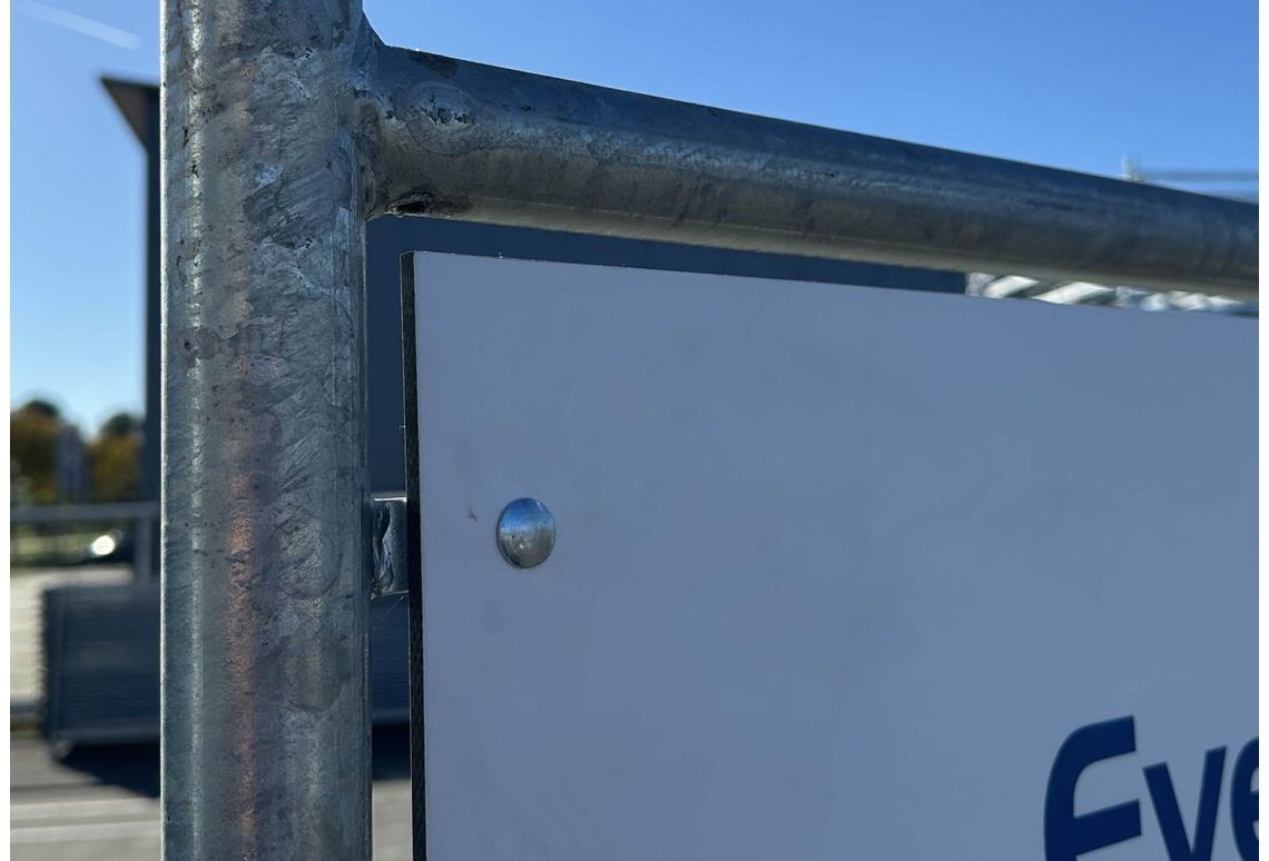 Montage: je kunt het reclamepaneel met acht slotbouten (niet inbegrepen) bevestigen in een reclameframe. Maak de boorgaten iets ruimer om kromtrekken te voorkomen. Houd rekening met het gewicht van het paneel – een extra paar handen kan handig zijn tijdens de montage.