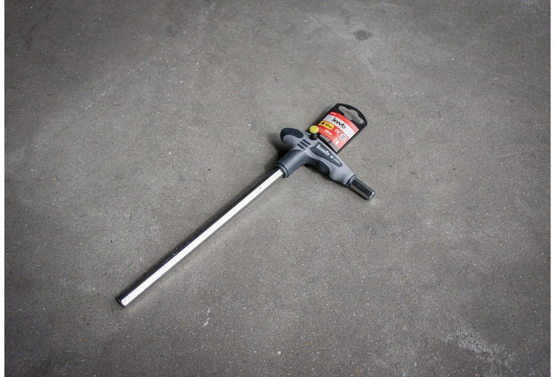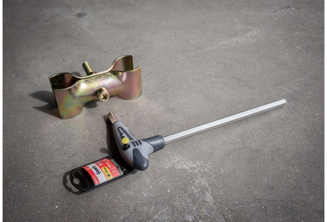 T-greep bouwheksleutel t.b.v. het handmatig aandraaien van bouwhek koppelingen met inbus 10mm, zoals de standaard koppeling en de koppeling 42/60 mm. Een handige tool om snel handmatig de koppelingen aan te draaien tussen de bouwhekken.